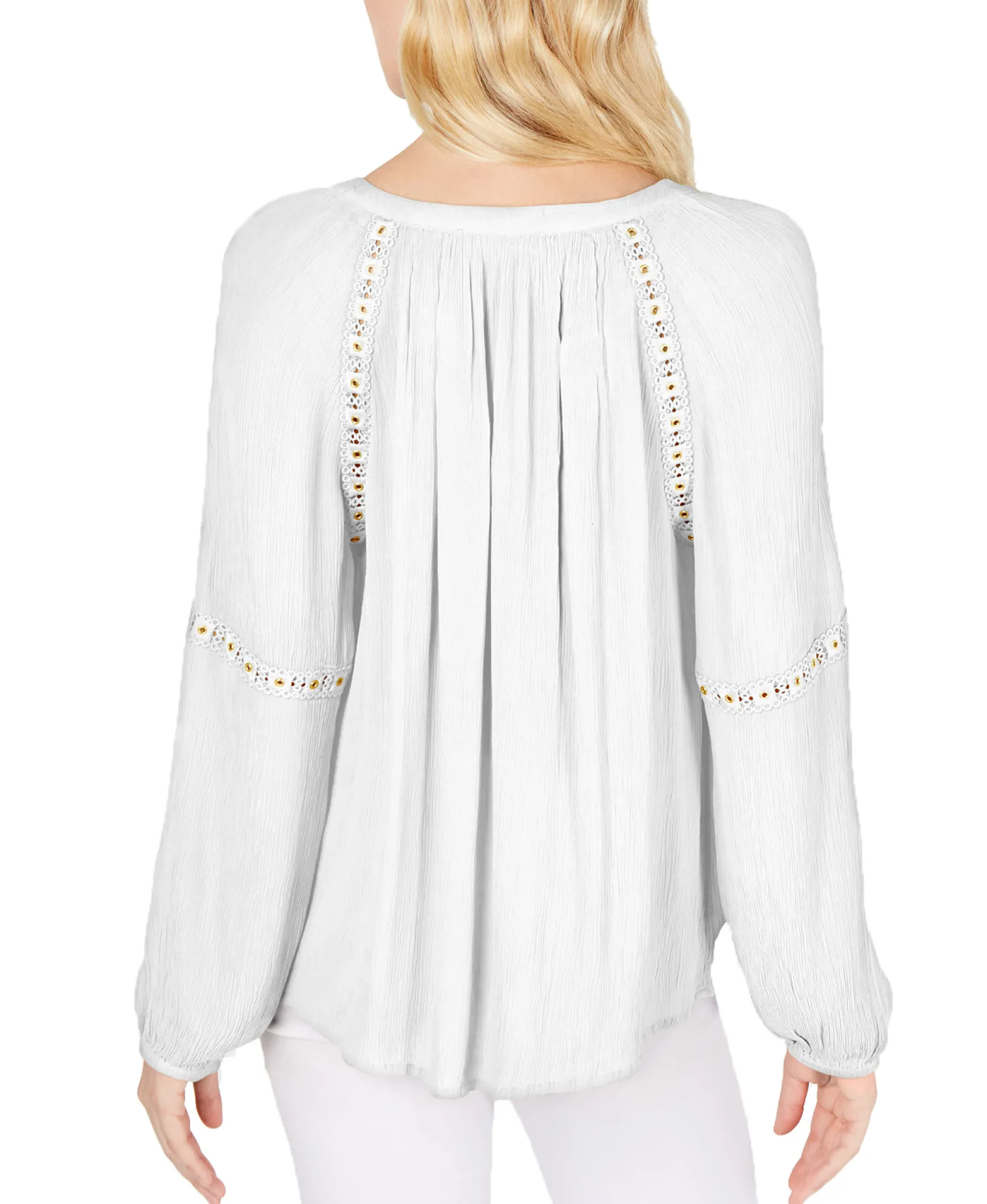 I.N.C. International Concepts reinvents the peasant top with this petite version styled with edgy grommets that trim the pretty crocheted trim.
