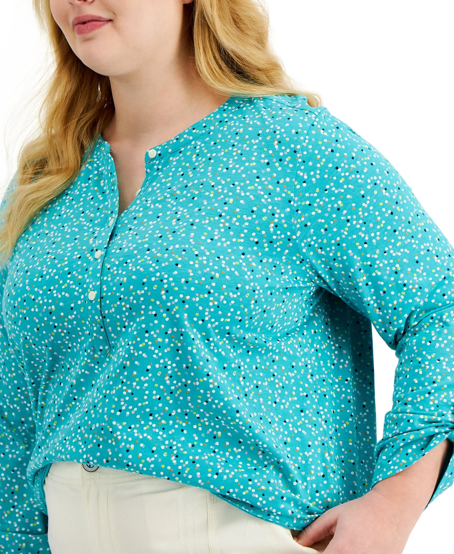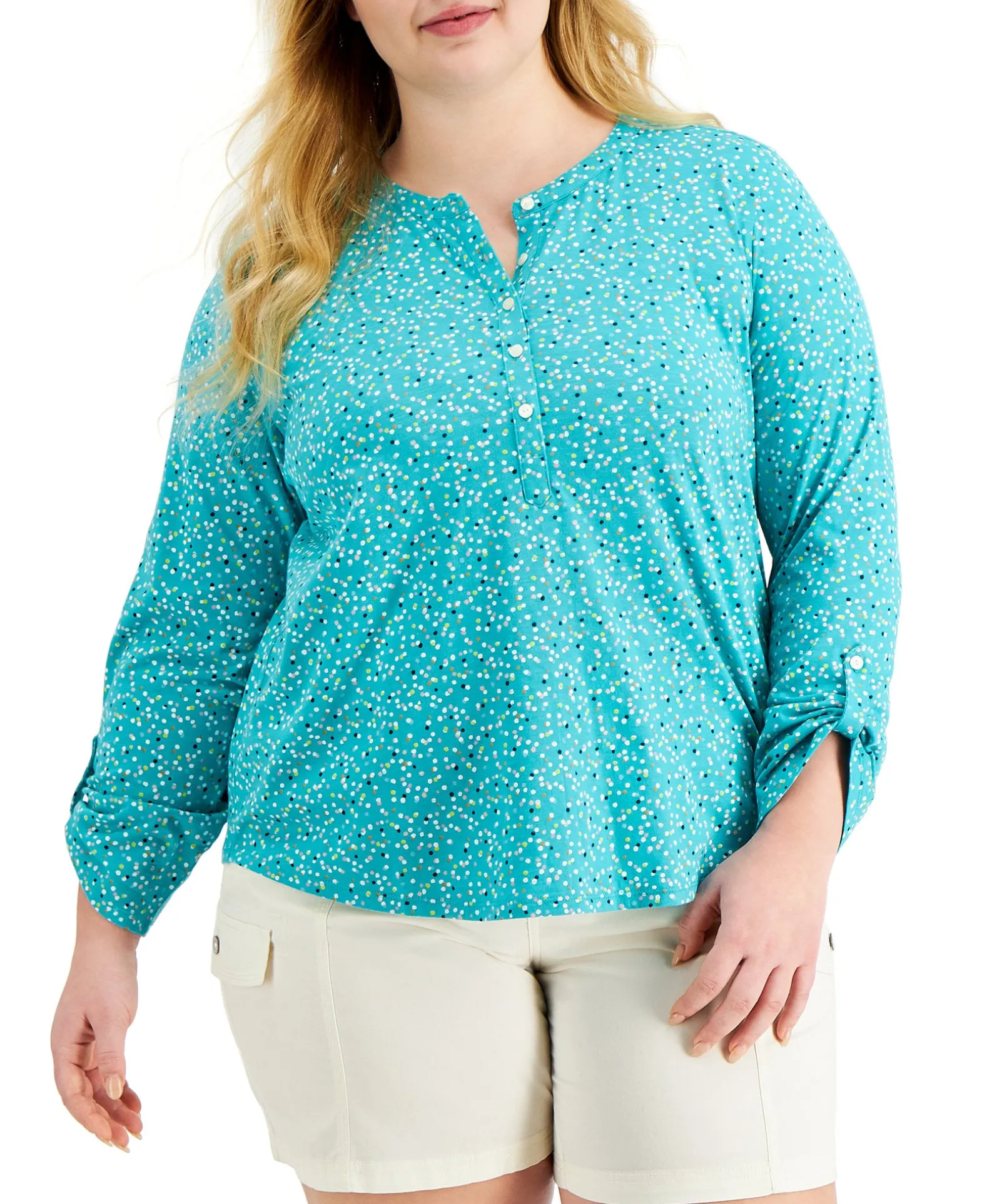Style & Co’s Plus Size Henley-Inspired Top Is Designed Entirely In Printed Cotton And Finished With Roll-Tab Sleeves.