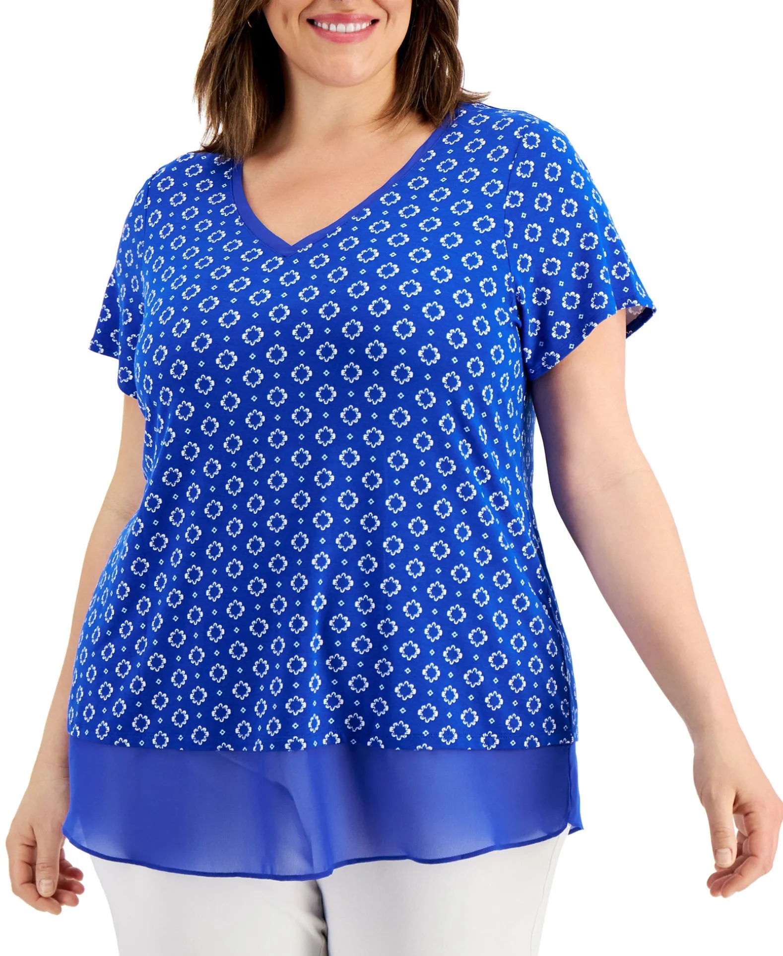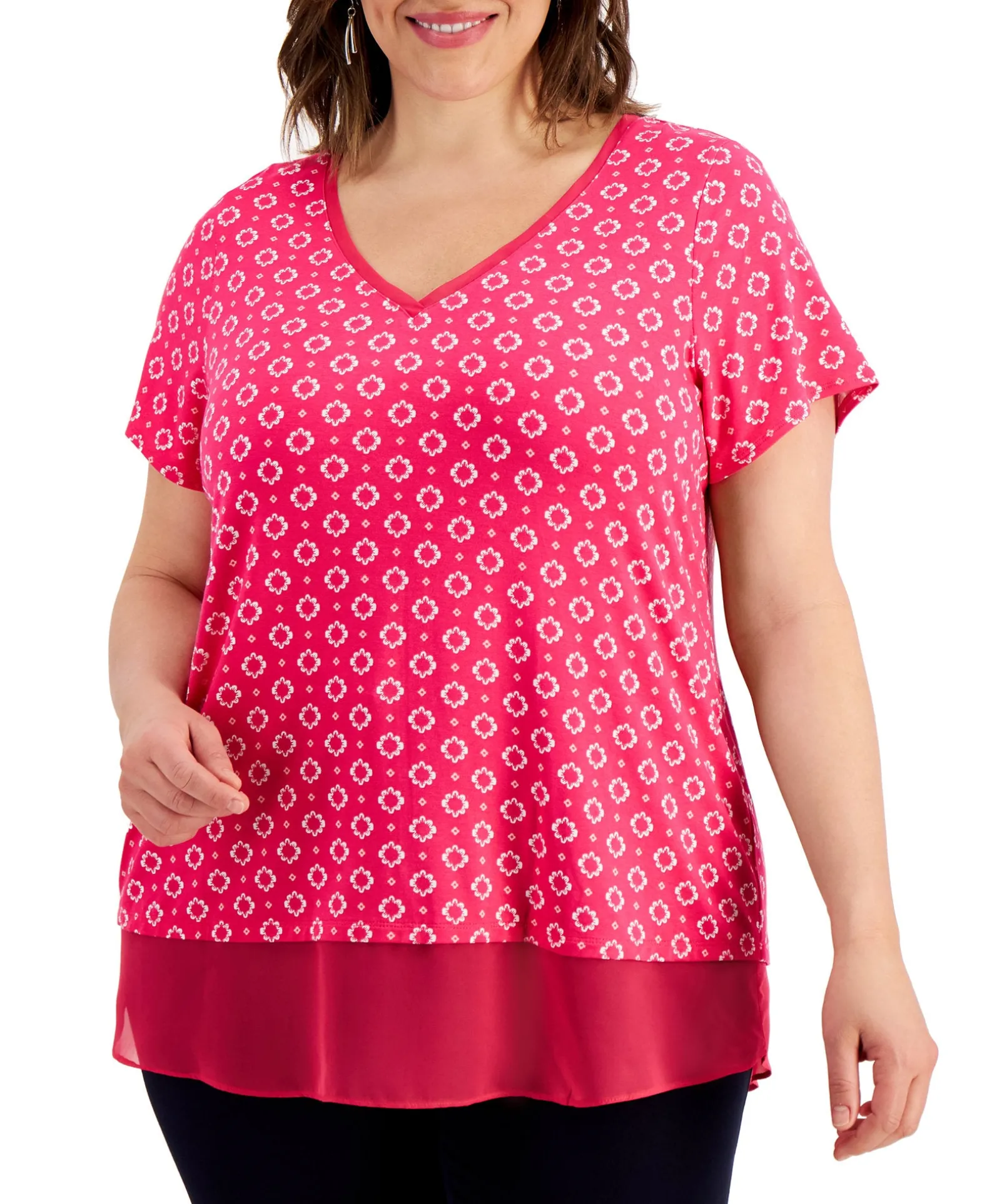 Light And Airy Solid-Color Contrast Accents The Charming Floral Print Of JM Collection’s Mina Plus Size Top In A Flattering Relaxed Shape.