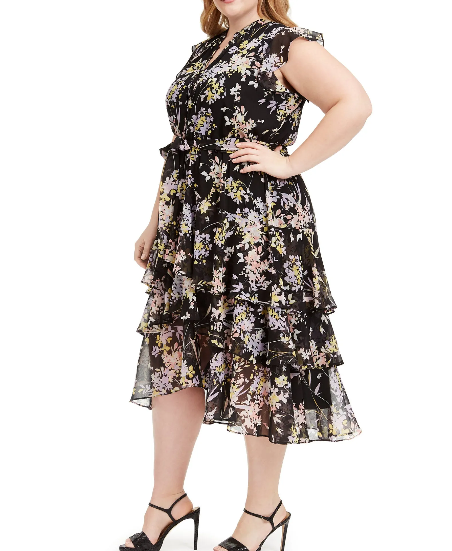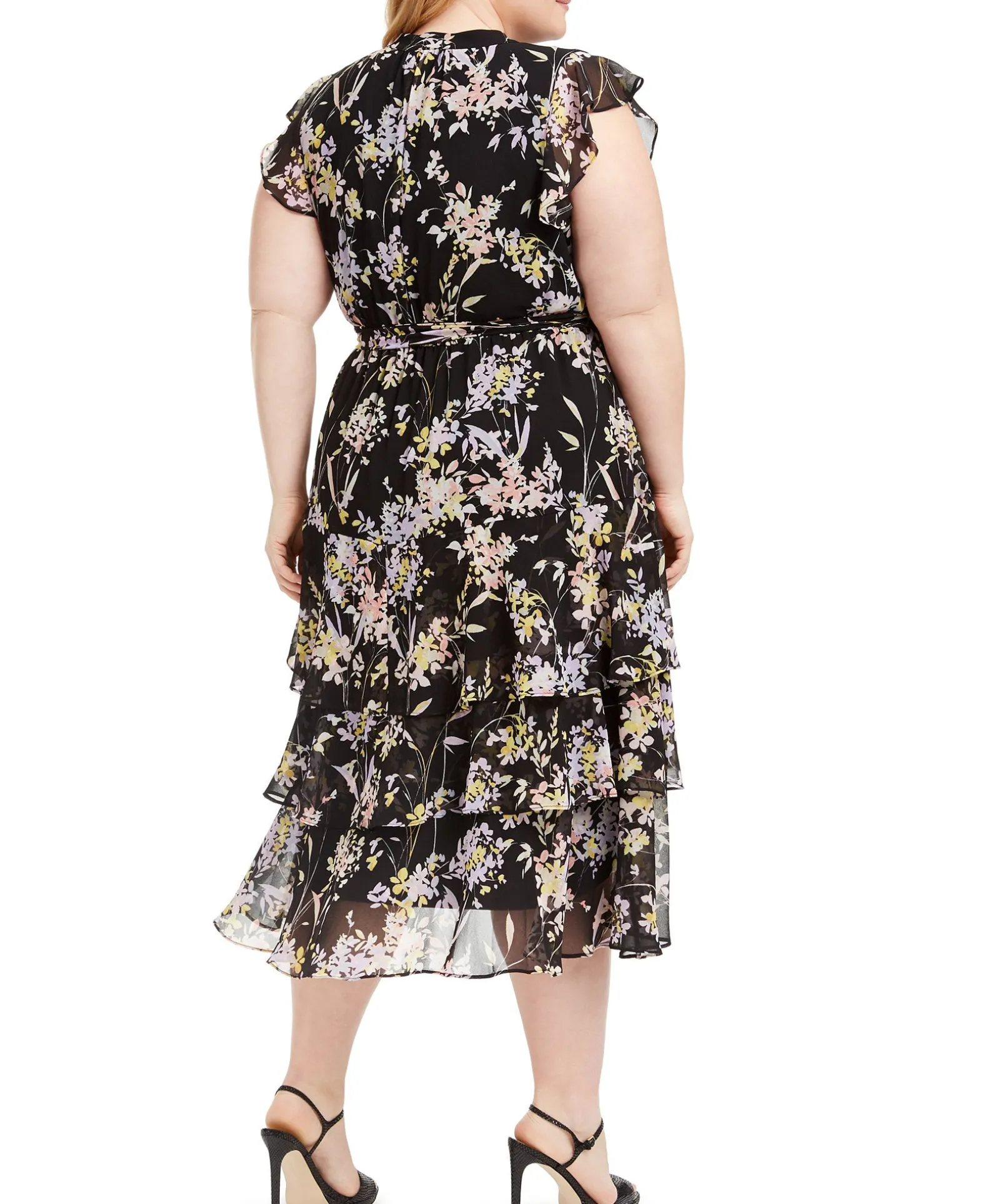 Calvin Klein’s Romantic Plus Size Dress Is Decorated With Flutter Sleeves And A Tiered, Ruffled Hemline That Hits Below The Knee.