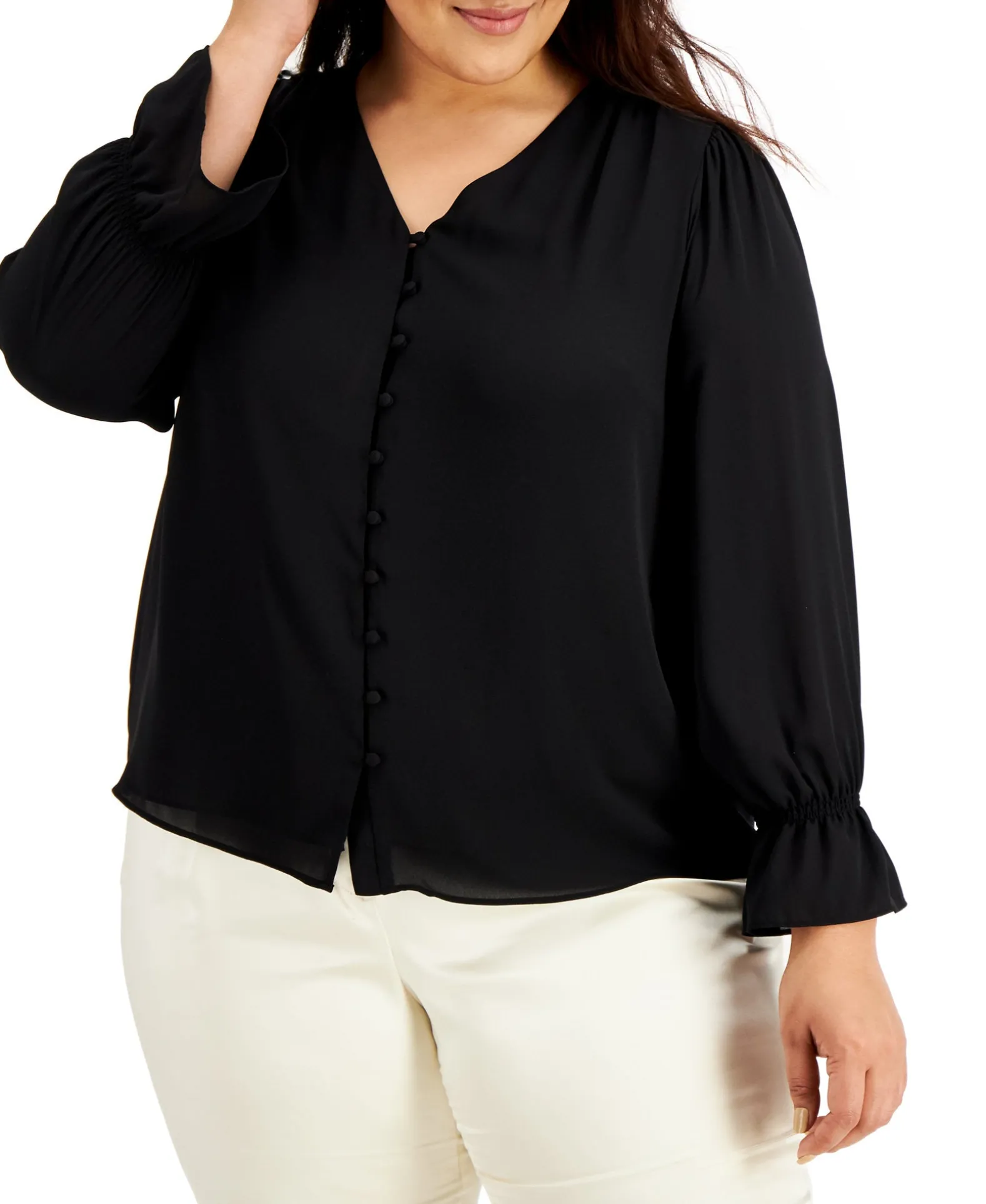 Add Flow To Your Wardrobe With Alfani’s Plus Size Button-Down Top, Featuring Blouson Sleeves And Sheer, Lightweight Fabric.