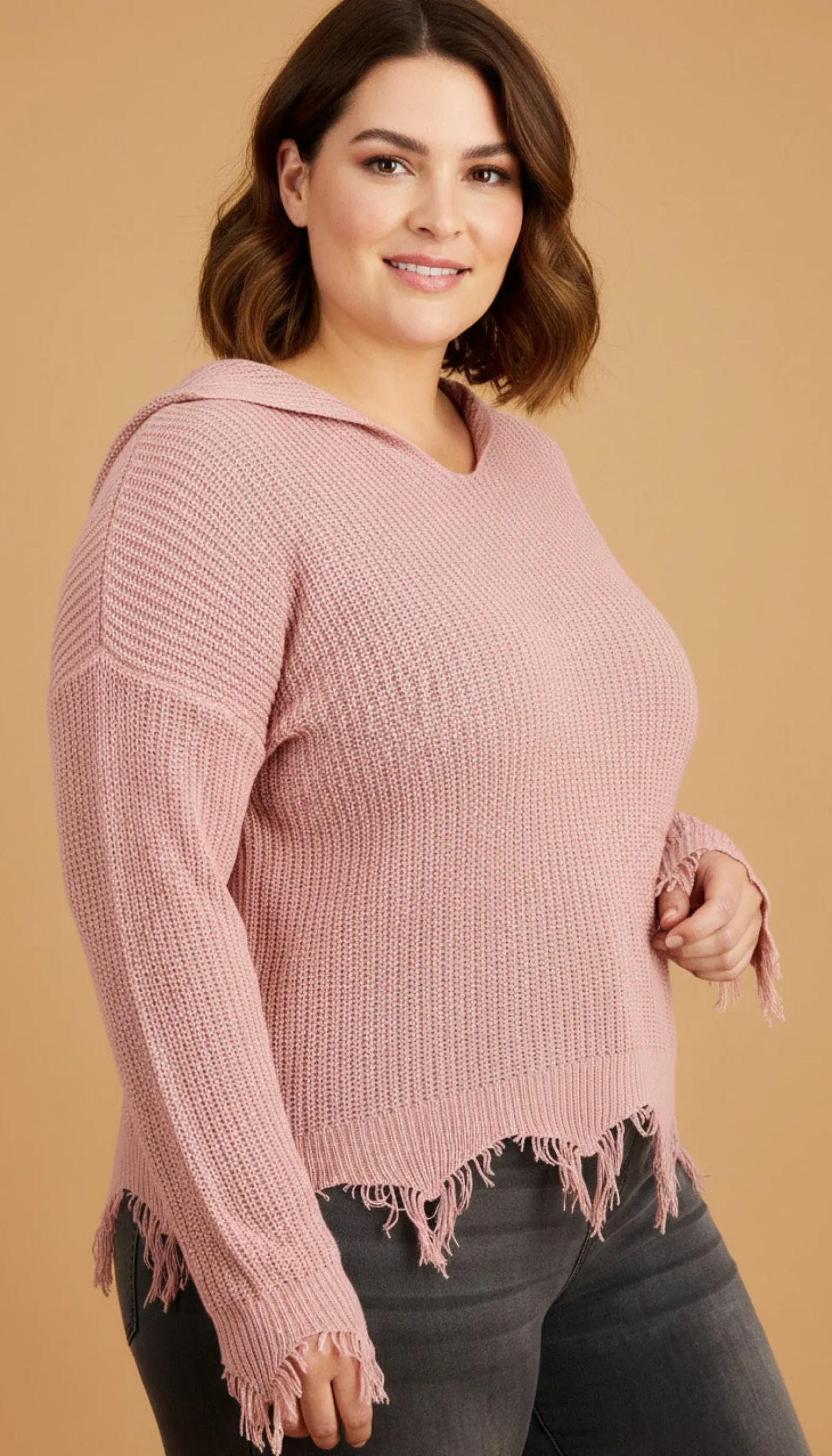 Distressed Details Add A Stylish Lived-In Look To This Plus Size Hooded Sweater From FULL CIRCLE TRENDS.