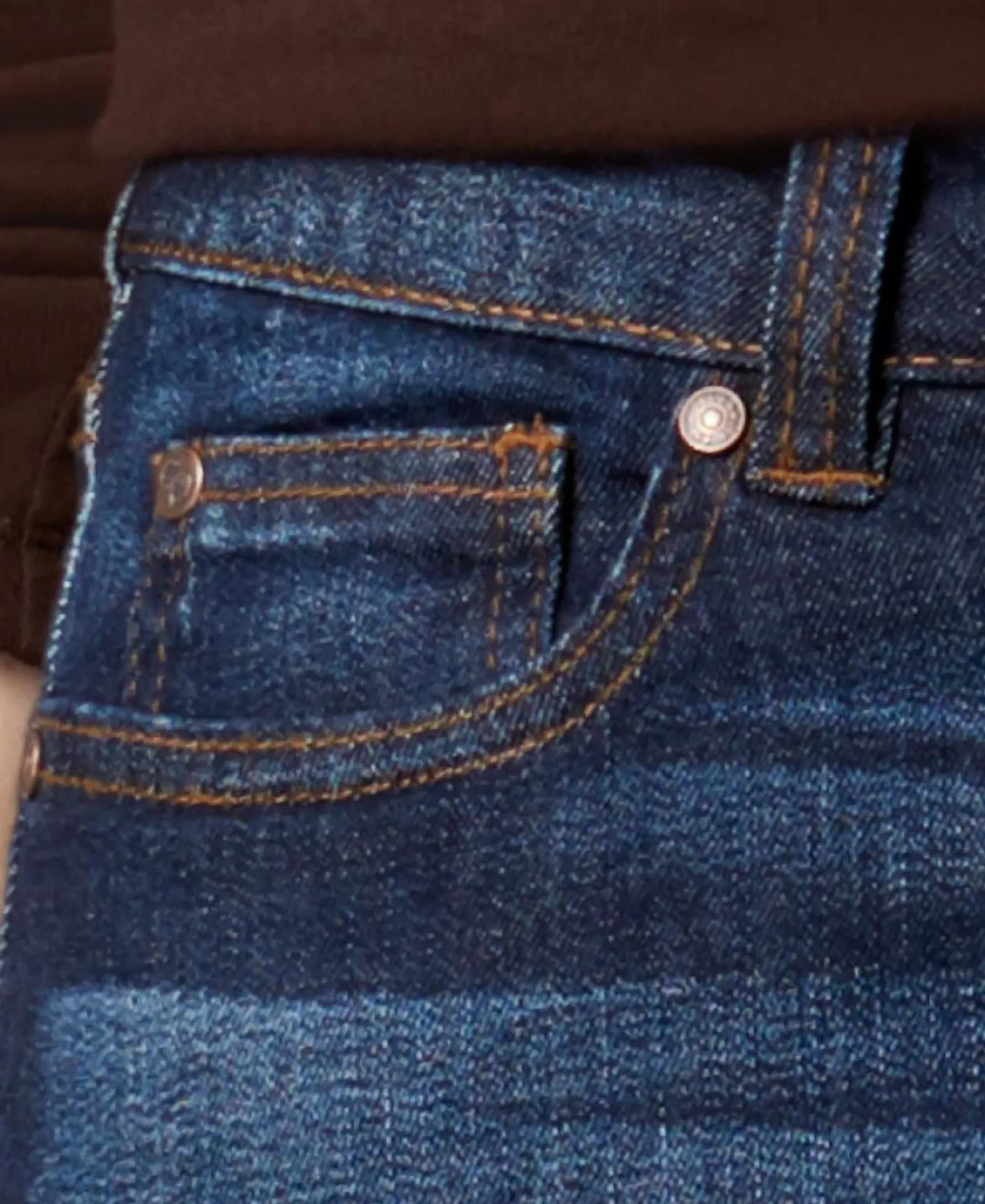 - Mid rise; regular fit through hips and thighs; cropped straight leg