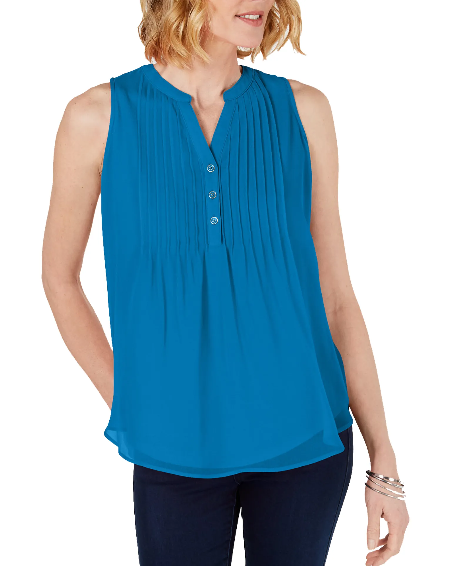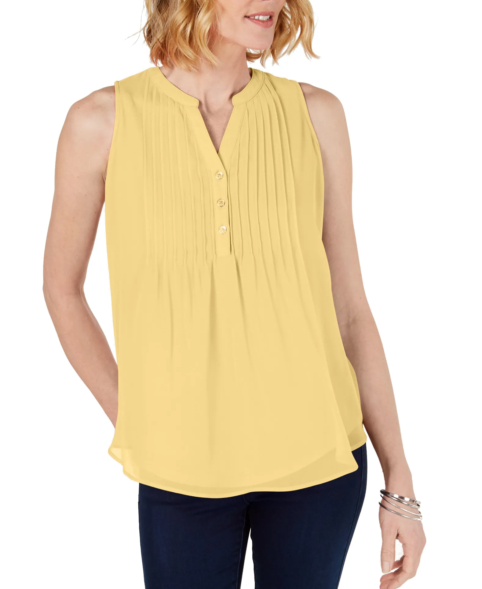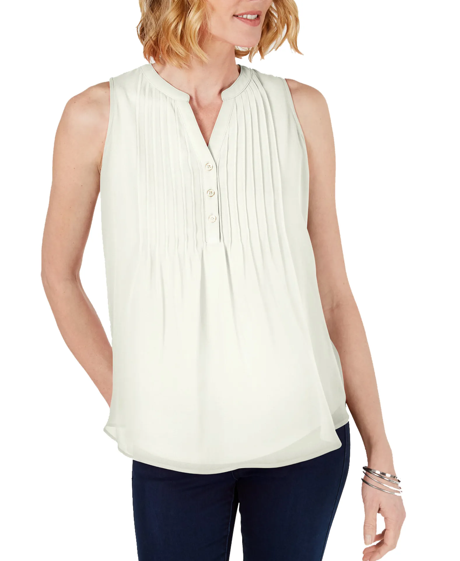 Subtle pintucked pleats add a unique touch and lend a flattering drape to this sleeveless blouse from Charter Club.