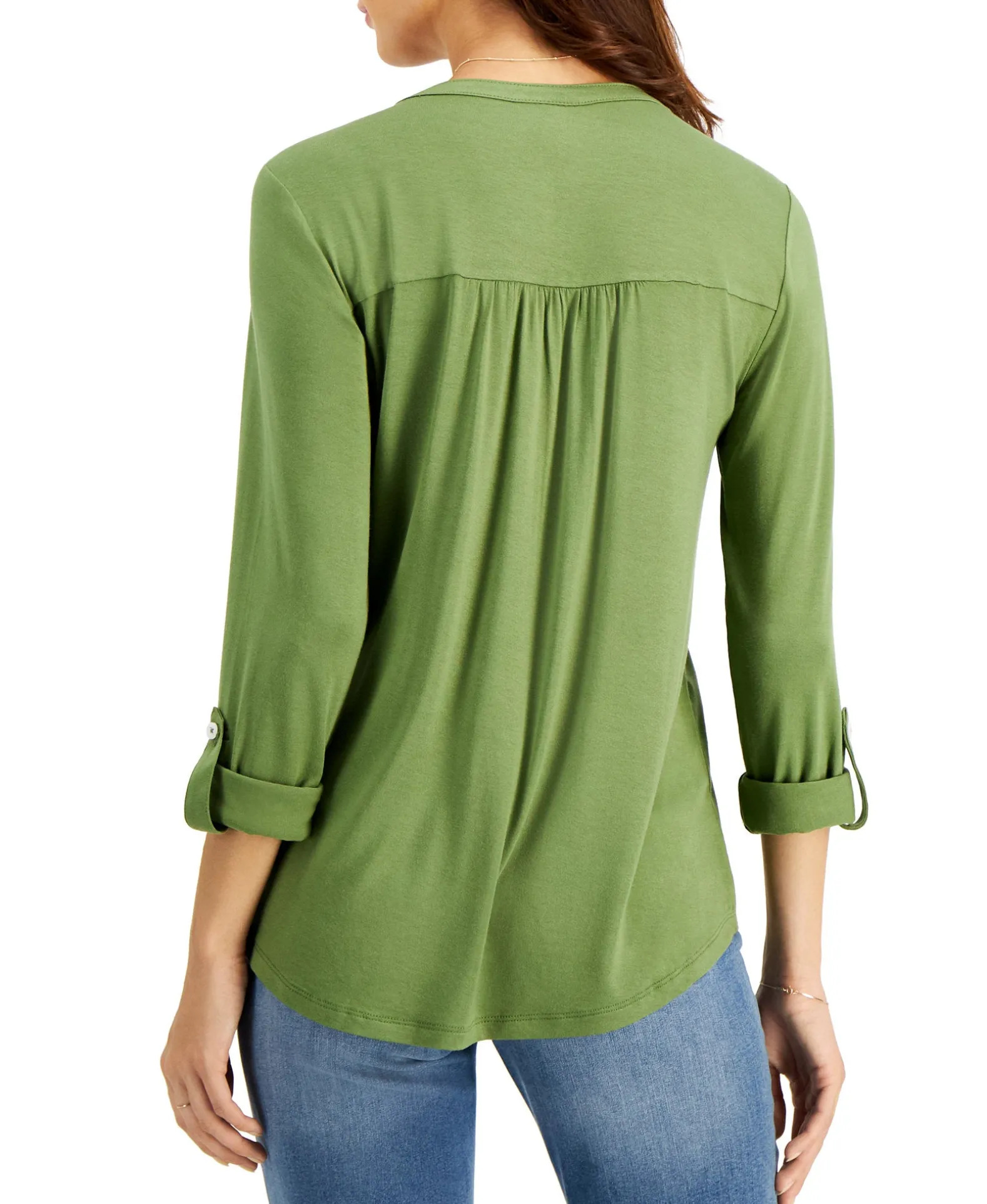 Classic, Collarless And Full Of Wardrobe Possibilities, Style & Co’s Split-Neck Top Sports Smart Roll-Tab Sleeves.