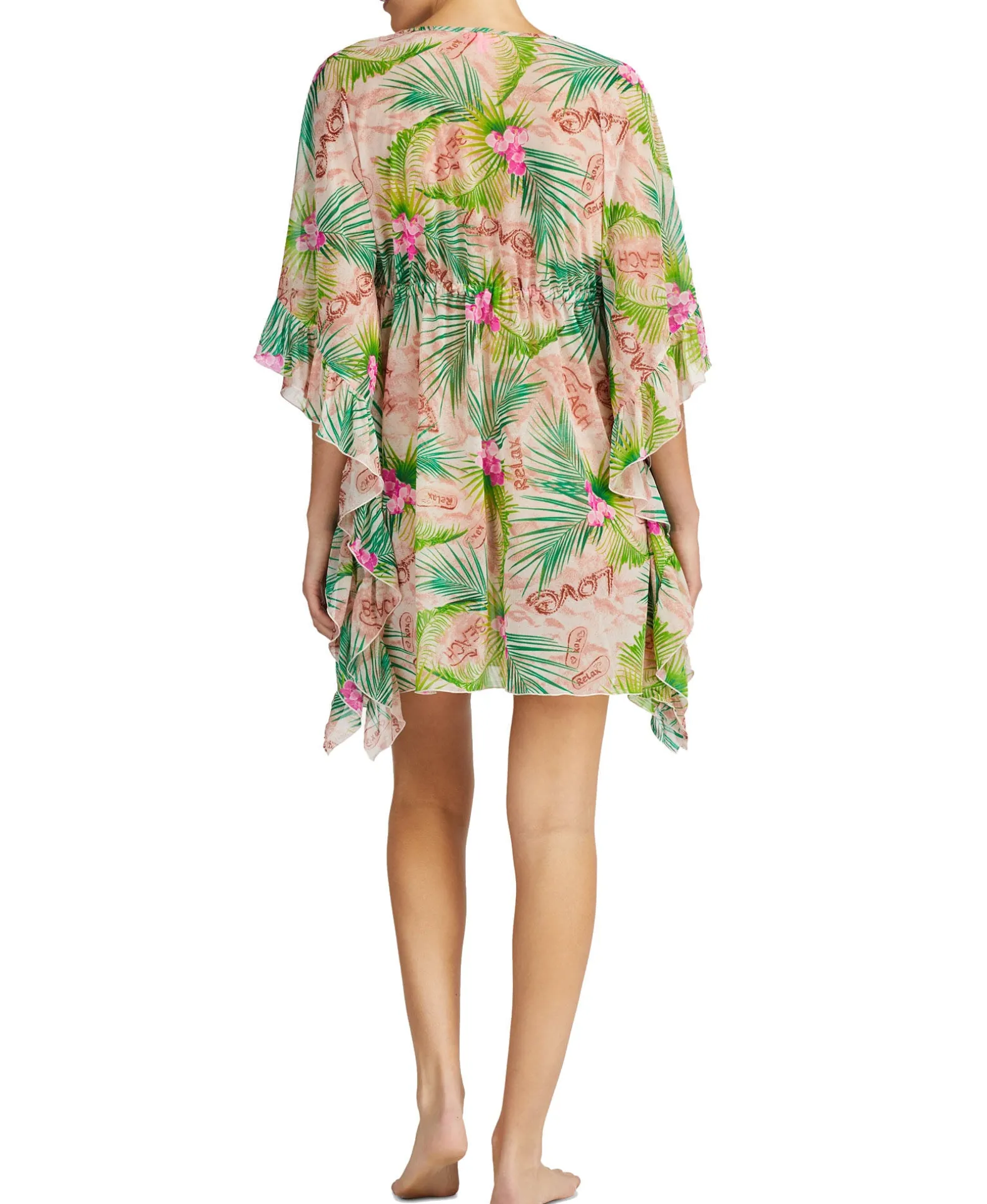 Dramatic ruffled cuffs adds stylish flair to this chic chiffon caftan from Betsey Johnson.