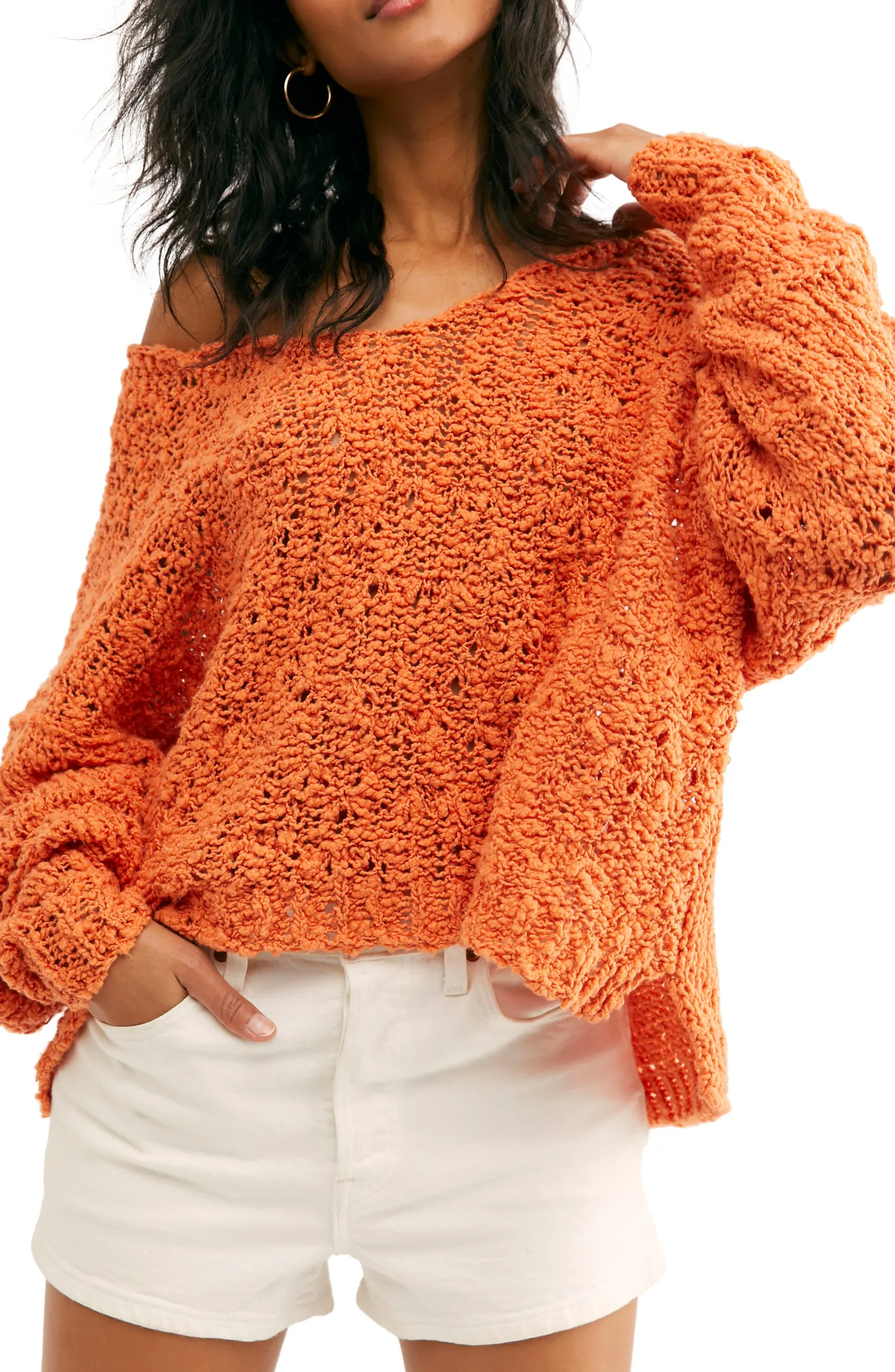 Free People’s Sunday Shore sweater is as carefree as a summer breeze with drop sleeves and a semi-sheer finish.