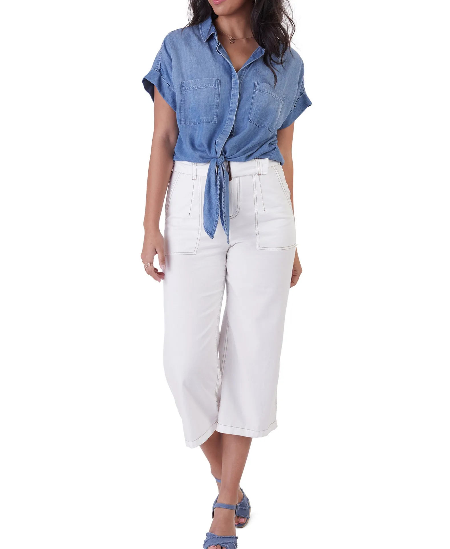 - Two front pockets; tie detail at front hem