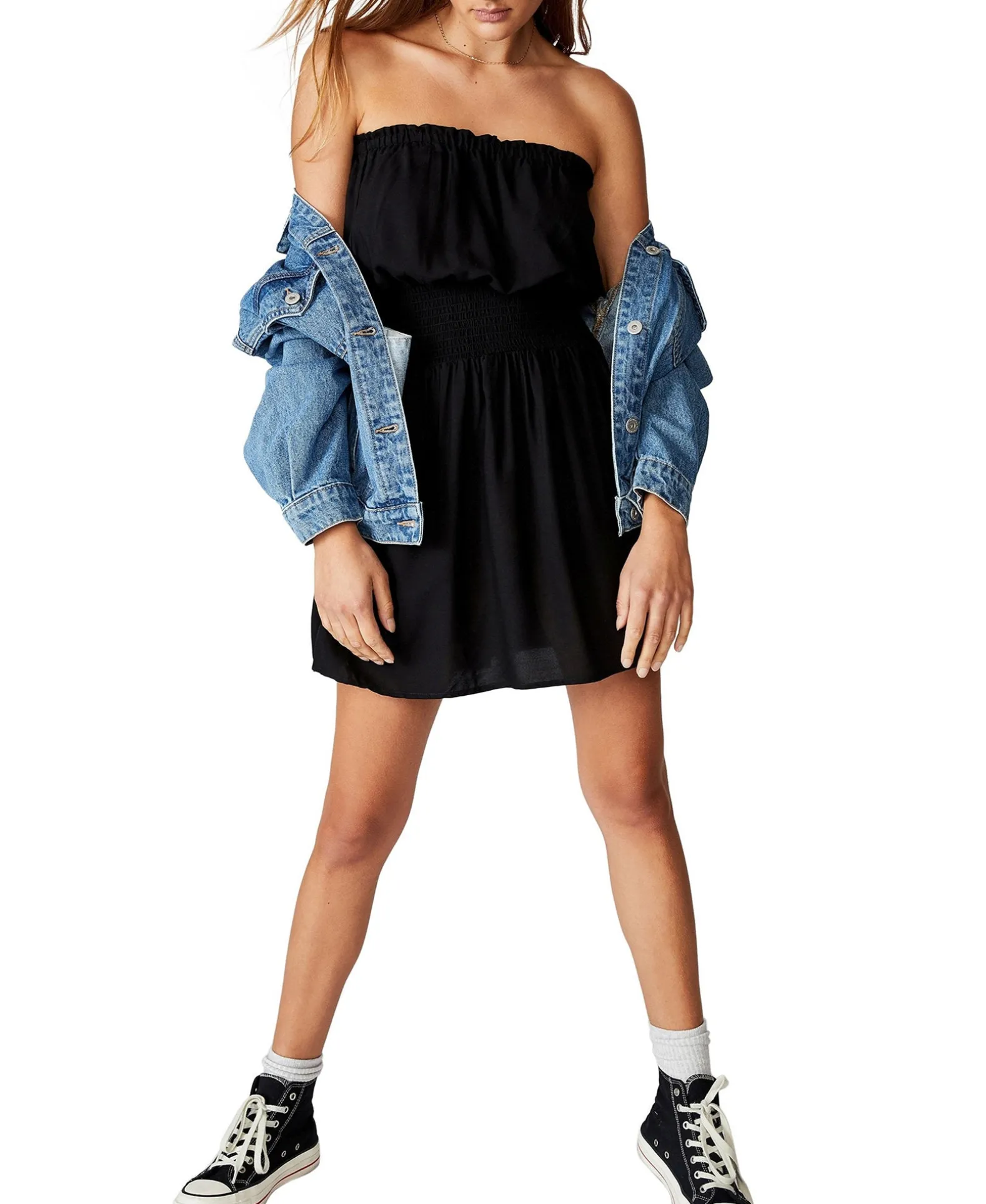 We Have The Perfect Dress For Your Girls Night Out. The Woven Leslie Strapless Mini Dress Is The Cutest Style For Warmer Weather. Wear It With Sandals For A Beach To BBQ Look, Or Add Some Heels For That Night Out.